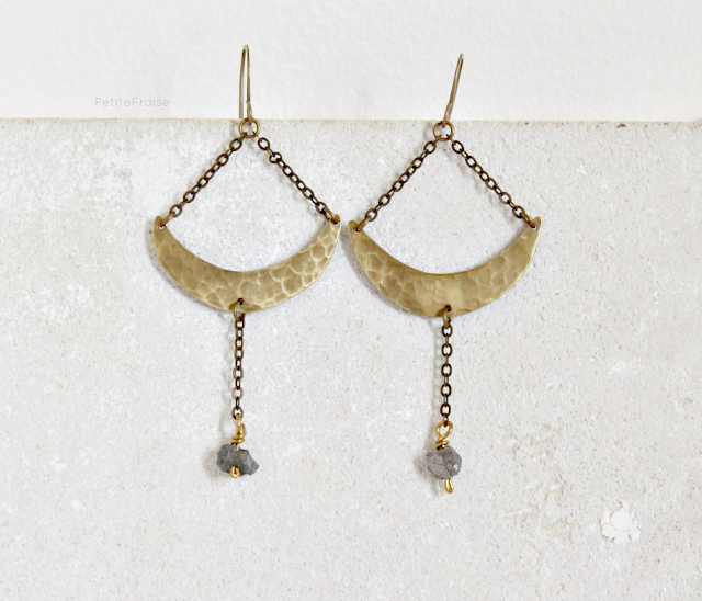 The "main character" are these brass crescent moon earrings with pyrite gemstones, which I recently added to my PetiteFraise Handmade Jewelry Etsy shop. As always, the brass is cut and worked by hand by me.